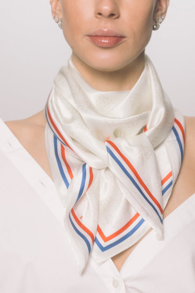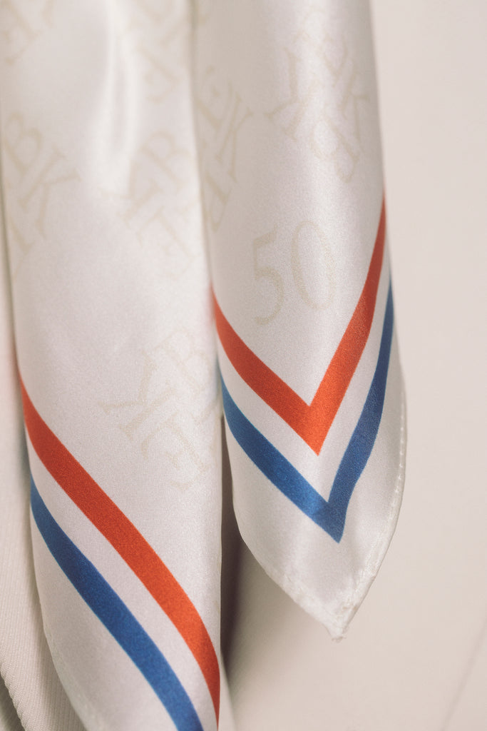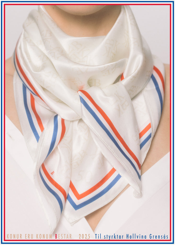 Töluna 50 má finna í tveimur hornum klútsins í tilefni af 50.ára afmæli kvennafrídagsins.